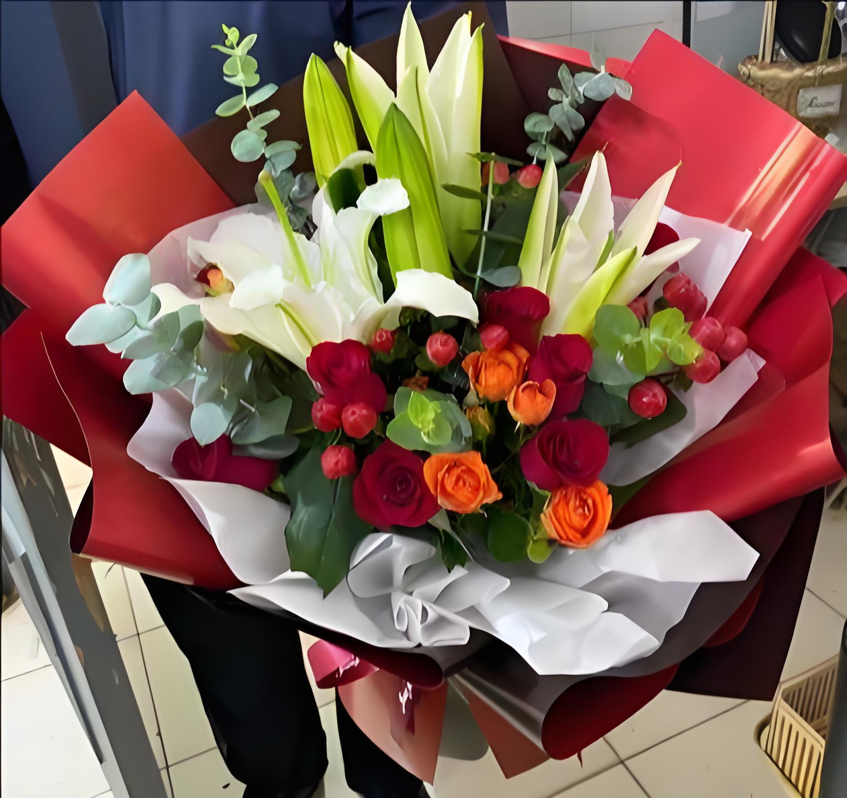 滨州邹平市花店包11枝红玫瑰、2枝多头白百合、6枝橙色多头玫瑰、红豆、尤加利叶